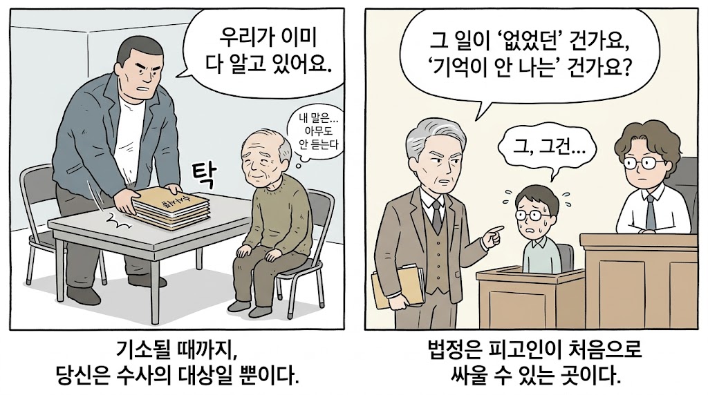 • ⚡ 수사는 검사의 턴, 재판은 피고인의 턴: 기소 전까지 ‘수사 대상’이었던 피고인이 비로소 목소리를 내는 곳이 바로 법정입니다.